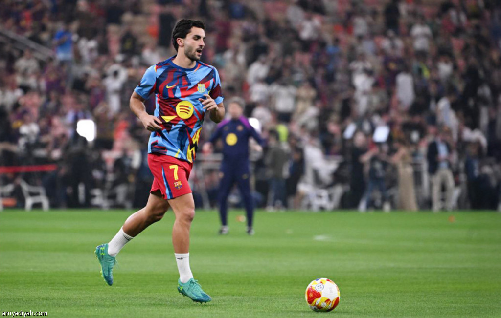 فيران توريس مهاجم برشلونة خلال الإحماءات قبل انطلاق مباراة بلباو، الأربعاء على ملعب الإنماء في جدة تصوير: علي خمج