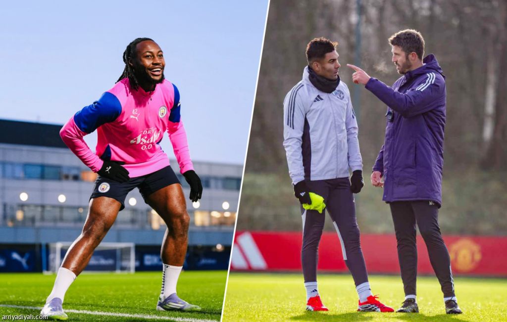 شرح الصورة: مايكل كاريك مدرب مانشستر يونايتد يتحدث إلى لاعب الوسط البرازيلي كاسيميرو خلال الحصة التدريبية الجمعة.. والغاني أنطوان سمينيو مهاجم سيتي يستعد لأول ديربي له أمام يونايتد (المركزان الإعلاميان- يونايتد وسيتي)