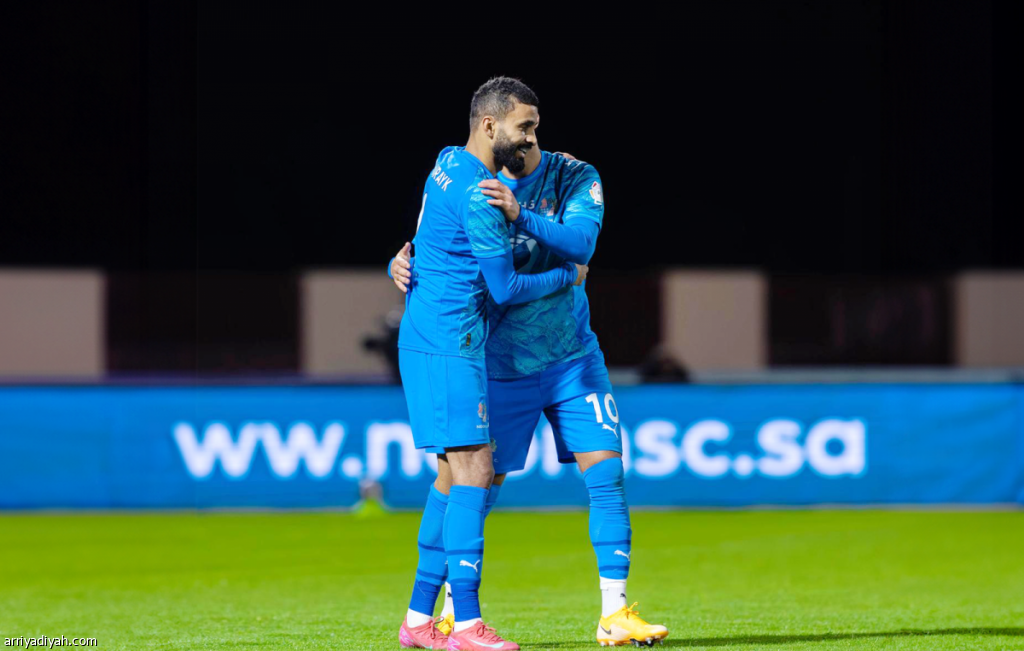 البريك وبن رحمة بعد إحراز الأول هدفًا صنعه الثاني أمام الهلال، الأحد في تبوك (المركز الإعلامي- نيوم)