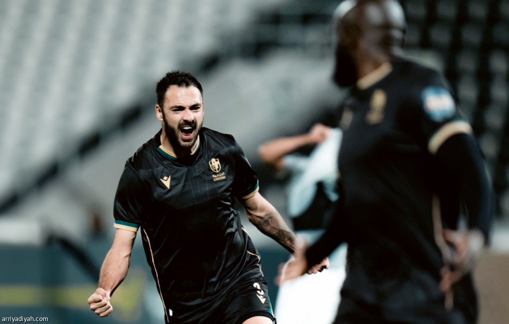 الفرنسي جايتان لابورد، لاعب الدرعية، يحتفل بهدفه على الطائي (المركز الإعلامي ـ نادي الدرعية)