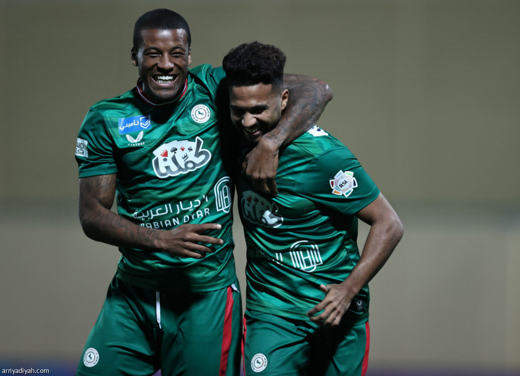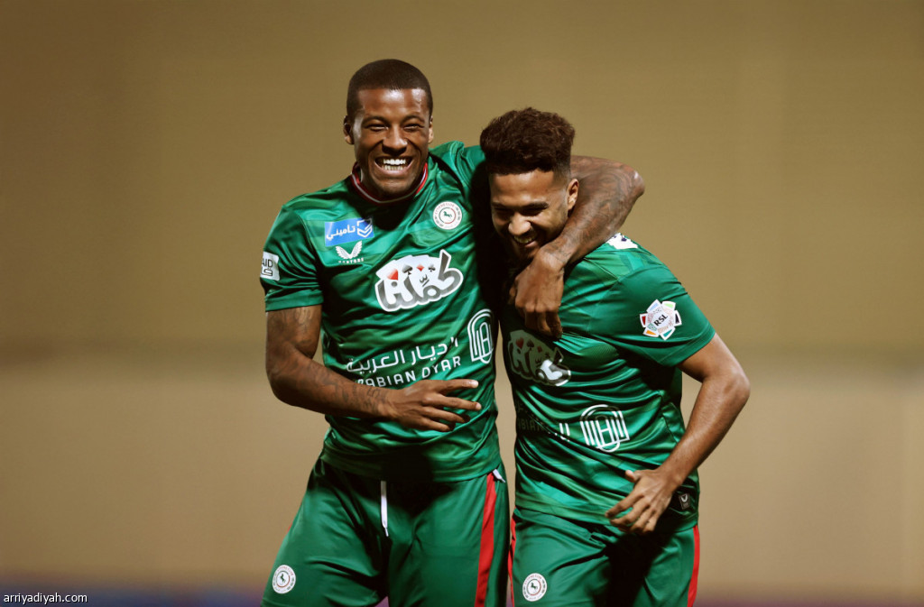 خالد الغنام لاعب فريق الاتفاق يحتفل بهدفه الأول أمام الخلود مع زميله الهولندي جيورجينو فينالدوم تصوير: سعد العنزي