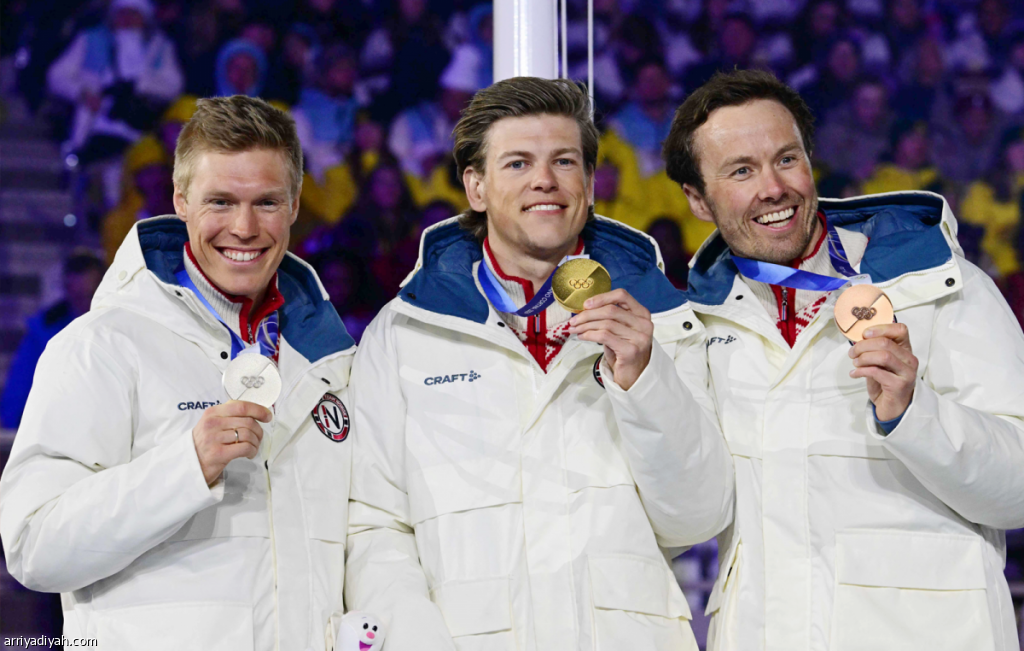 النرويجيون مارتن لويستروم نينجيت، الحاصل على الميدالية الفضية، ويوهانس هوسفلوت كلايبو، الحائز على الذهبية، و إيميل إيفرسن، الحاصل على البرونزية، على منصة التتويج في نهائي سباق الانطلاق الجماعي لمسافة 50 كيلومترًا رجال ضمن دورة الألعاب الأولمبية الشتوية ميلانو كورتينا 2026 (الفرنسية)