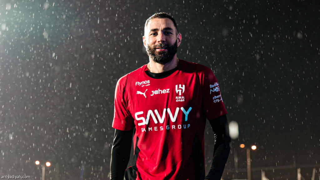 كريم بنزيما نجم الهجوم الهلالي خلال الحصة التدريبية للفريق، التي أجريت تحت المطر الأربعاء على ملعب النادي في الرياض (المركز الإعلامي ـ الهلال)