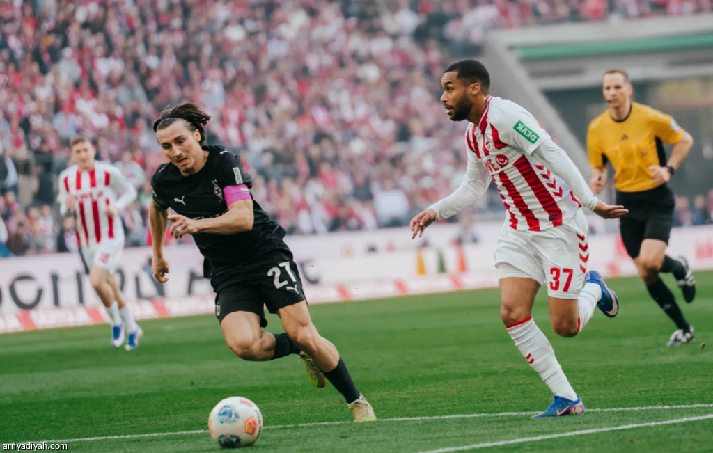 لينتون ماينا جناح كولن يحاول المرور بالكرة من أمام ريكو ريتز لاعب وسط بوروسيا مونشنجلادباخ خلال مباراتهما، السبت (المركز الإعلامي ـ كولن)