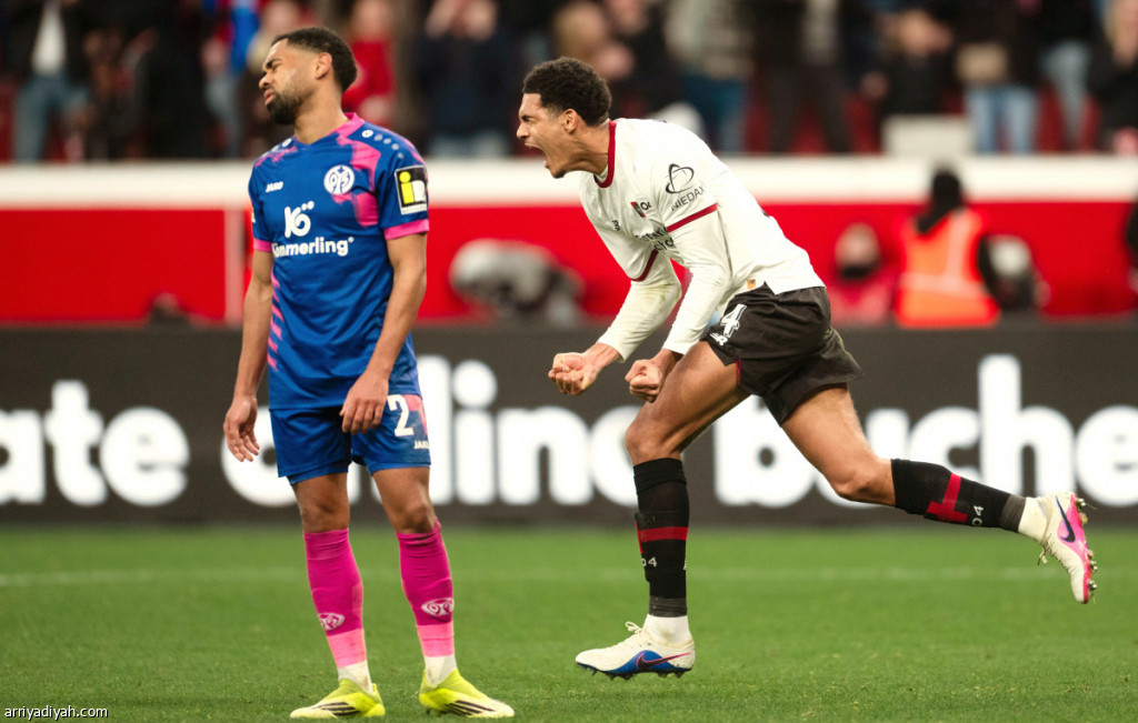 جاريل كوانساه مدافع باير ليفركوزن يحتفل بتسجيله هدفًا في شباك ماينز 28 فبراير الماضي (أسوشيتد برس)