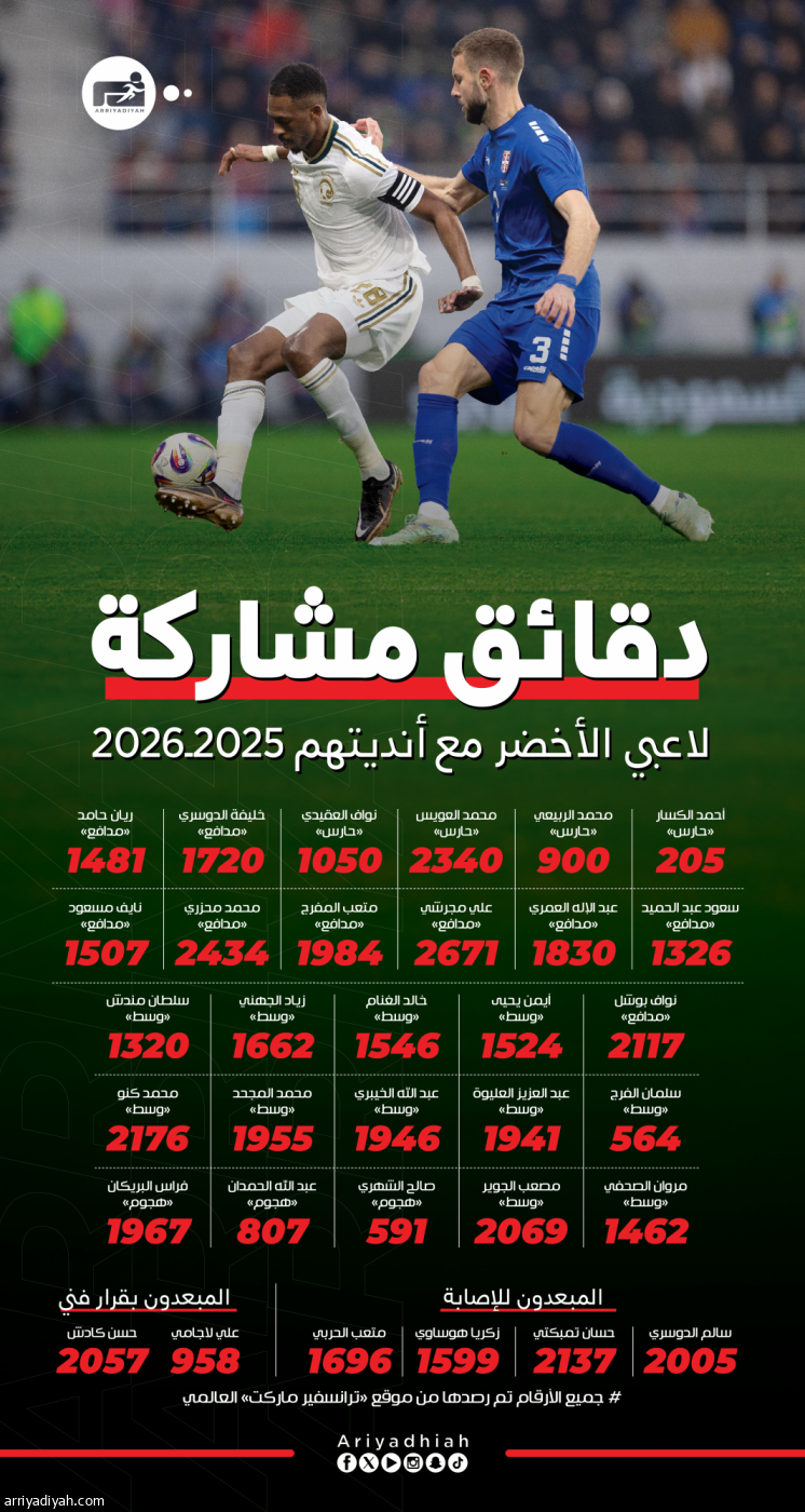 دقائق مشاركة لاعبي الأخضر مع أنديتهم 2025ـ2026
