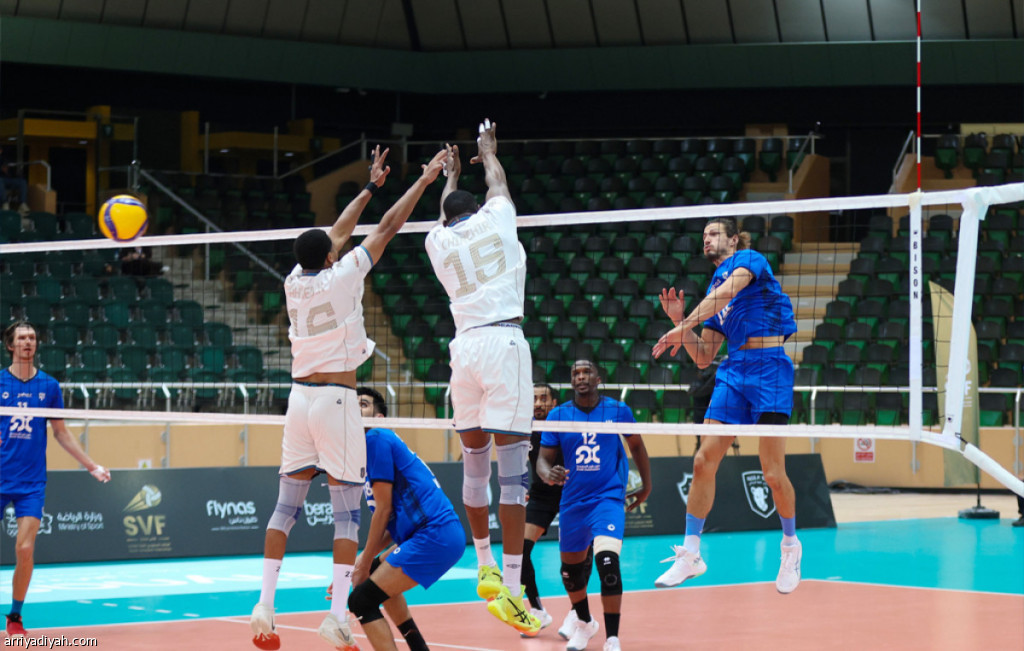 لاعب فريق الهلال يسدد كرة تعبر حائط صد فريق العلا المكون من لاعبين خلال مواجهة الفريقين في أولى مباريات كأس النخبة للكرة الطائرة، الأربعاء (المركز الإعلامي ـ اتحاد الطائرة)
