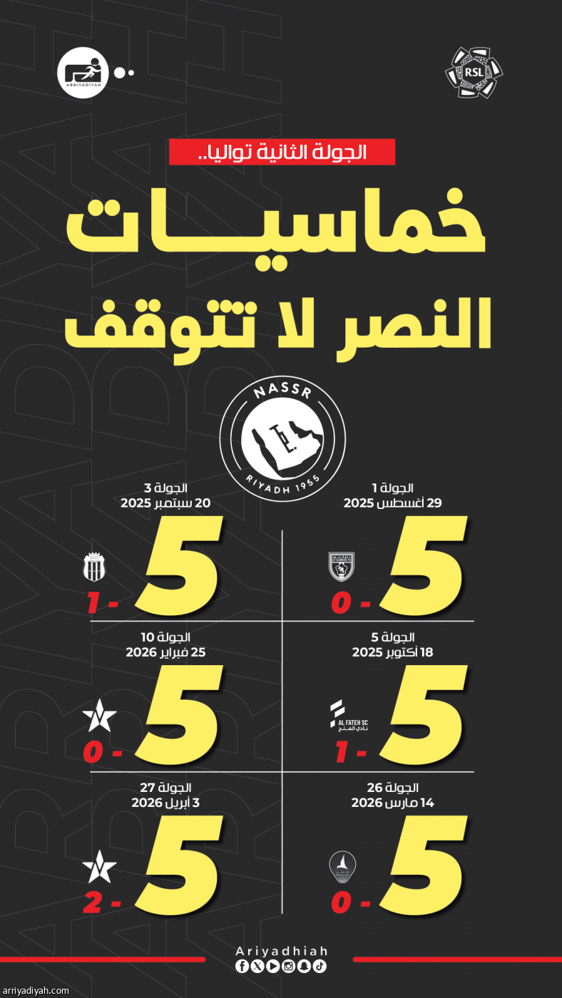 الجولة الثانية تواليا .. خماسيات النصر لا تتوقف