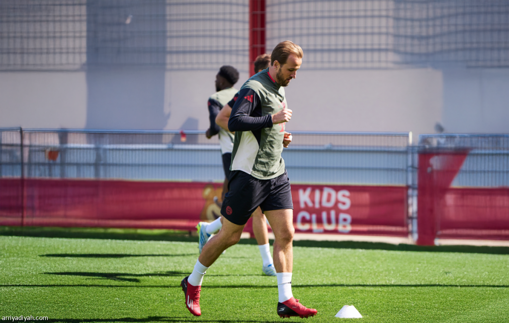 الإنجليزي هاري كين قائد فريق بايرن ميونيخ الألماني الأول لكرة القدم، الأثنين، يُشارك في الحصة التدريبية الأخيرة قبل مواجهة ريال مدريد. (المركز الإعلامي - بايرن ميونيخ)