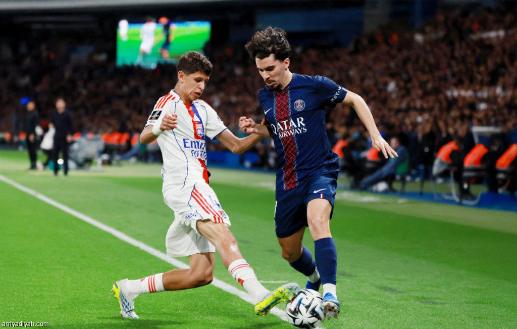 البرتغالي فيتينيا لاعب وسط باريس سان جيرمان، يمينًا، في لعبة مشتركة مع خالص ميراح لاعب ليون في مباراة الفريقين، الأحد (رويترز)