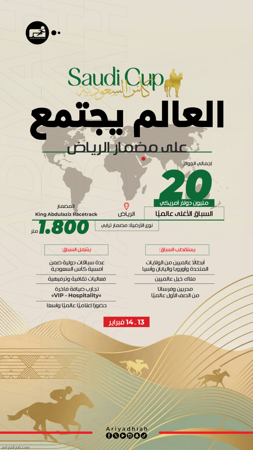 تنطلق النسخة السابعة من بطولة «كأس السعودية» لسباقات الخيل يومي الجمعة والسبت الموافقين للثالث عشر والرابع عشر من فبراير لعام 2026، التي يحتضنها ميدان الملك…