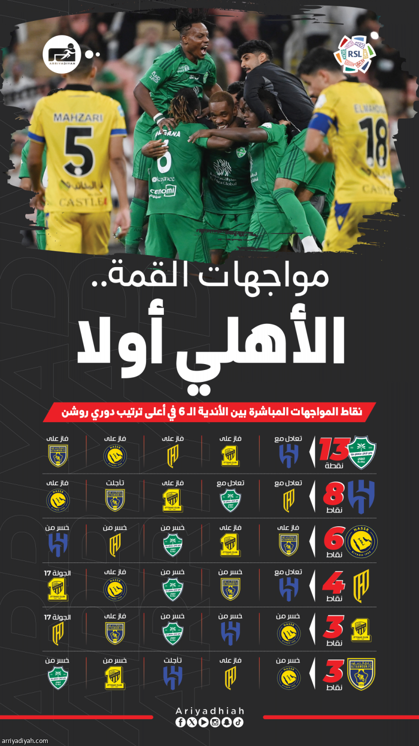 اختتم فريق الأهلي الأول لكرة القدم مواجهاته المباشرة أمام منافسيه على المراكز الـ6 الأولى في دوري روشن السعودي، بعد أن كسب نظيره التعاون 2ـ1، الأربعاء،…
