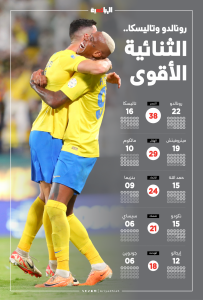 يتسلح فريق النصر الأول لكرة القدم، بثنائية هجومية تعد الأفضل في دوري روشن السعودي، بقيادة البرتغالي كريستيانو رونالدو، وزميله البرازيلي أندرسون تاليسكا، إذ سجل الأول 22 هدفًا، بينما أحرز الآخر 16 هدفًا بعد مرور 22 جولة من ...