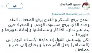وقال الصاعدي في رده على المقال: المدح يرفع السكر والقدح يرفع الضغط.. النقد وحده الذي يرفع مستوى الوعي والمحبة حين يتم عبر تداول ...