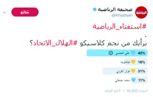 اختار 42% من المشاركين في استفتاء "الرياضية"، العماني علي الحبسي نجماً لكلاسيكو الكرة السعودية الذي أقيم بين فريقي الهلال والاتحاد أمس الأول على ملعب الملك فهد الدولي في الرياض، فيما اختار 31% فواز القرني نجماً للقاء، في ...