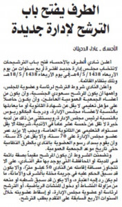 أعلن نادي الطرف بالأحساء فتح باب الترشيحات لانتخاب مجلس إدارة جديد لفترة أربع سنوات من يوم الأربعاء 4/5/1438هـ إلى يوم الأربعاء 18/5/1438هـ، وذلك بنظام القائمة. وأعلن النادي شروط الترشح لرئاسة وعضوية المجلس، وأهمها أن يكون ...