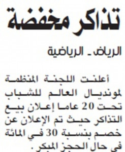 أعلنت اللجنة المنظمة لمونديال العالم للشباب تحت 20 عاما إعلان بيع التذاكر حيث تم الإعلان عن خصم بنسبة 30 في المائة في حال الحجز المبكر . وتتفاوت أسعار التذاكر بحسب الملعب، حيث تتراوح بين 50 إلى 100 ريال بحسب أعمار المشجعين.