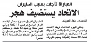 يلتقي اليوم الثلاثاء فريقا الاتحاد وهجر في مباراة مؤجلة من الجولة الـ 11 من الدوري الممتاز للشباب تحت 20 سنة (تأجلت بسبب ظروف الطيران لفريق هجر). يحتل الاتحاد المركز التاسع برصيد 13 نقطة ويأتي هجر خلفه برصيد 12 نقطة، وستقام ...