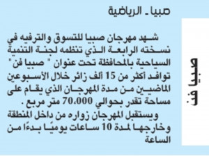 شهد مهرجان صبيا للتسوق والترفيه في نسخته الرابعة الذي تنظمه لجنة التنمية السياحية بالمحافظة تحت عنوان " صبيا فن" توافد أكثر من 15 ألف زائر خلال الأسبوعين الماضيين من مدة المهرجان الذي يقام على مساحة تقدر بحوالي 70,000 متر ...